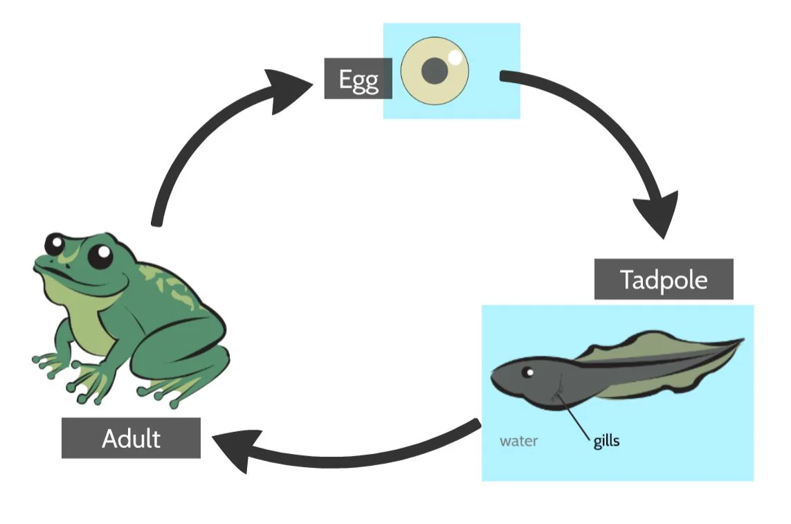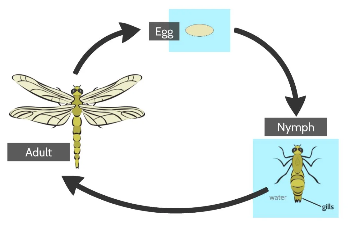 Nymph (moults, breathes using gills to take in dissolved oxygen from the water) ===>