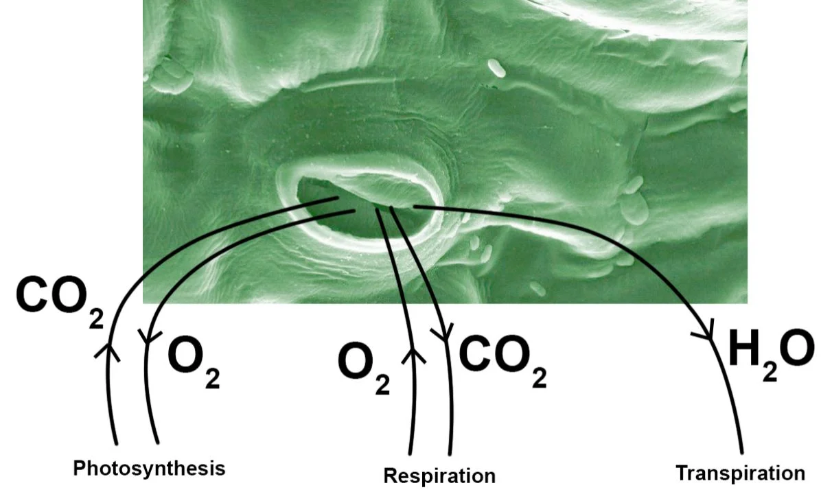 Oxygen is taken in for respiration, while carbon dioxide is given out.Transpiration occurs all the time. Plants lose water as water vapour through the stomata.